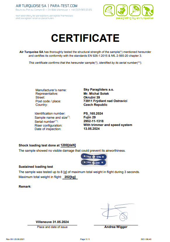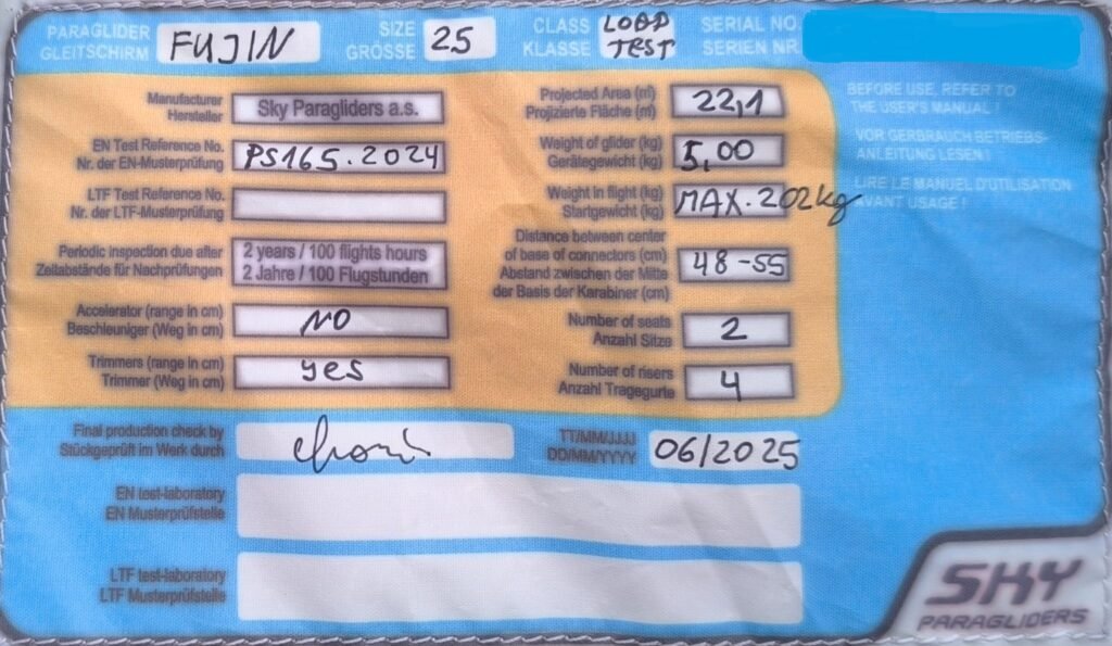 Intermediate pilot takes Fujin 29 m2 and flies solo with take-off weight 100 Kg at 25 km/h wind speed.
